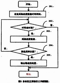 亮度感应自动控制的自动校正算法的步骤:首先设定采集亮度数据的时间间隔以及设定采样次数;当时间间隔定时到时,读取光感应器亮度的数据;当采样次数到达预设次数后,输出稳定的亮度;再由CPU输出稳定的PWM,去控制液晶面板的背光。设定采集亮度数据时间间隔201是初始化每次采集光感应器亮度的时间。时间定时到202是达到可以去采集光感应器亮度的时间。采集亮度数据203是CPU读取光感应器亮度数据通过ADC的数字信号的数值。到达采样次数204是到达采集亮度数据都一样的次数,表示环境亮度已经稳定,不再变化。输出稳定的亮度205是CPU输出稳定的PWM去控制液晶面板的背光。如图3亮度感应自动控制的自动校正算法的工作流程所示。