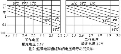 与铝电解电容器不同,超级电容器施加电压的寿命要比不施加电压的寿命短。在额定电压以下,超级电容器施加的电压与超级电容器寿命的关系如图2。