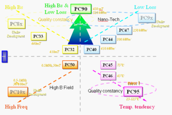 下面对高性能的材料做一个简单介绍。LED变压器的系统需要高饱和磁通密度和低损耗的特点,TDK开发了一个PC47系列的变压器材料,它的发展方向就是下图箭头所指的方向,纵轴是饱和度磁通密度和低损耗。这边是我们对比市面一些通用的磁芯变压器,和TDK现在所研发和不断更新产品特性的比较。从右下角,粉红色的点是目前市场上常用的一些材料的性能,横坐标是磁通量,纵坐标是饱和的密度。我们可以发现从现在市场上这些粉红色的点是在500Core Loss,磁通密度在380,跟TDK PC40材料是相当的。PC47材已经有很大的改善,在420的磁通密度,在250左右的Core Loss,也就是说相比通常所用的系列有比较大的改善。