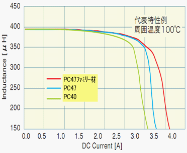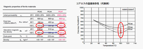 - PC47在100℃的磁芯损耗相比PC40降低了约40%