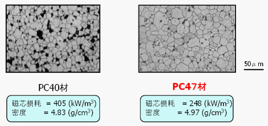 至于高性能材质的研发,设计的原理,材质研发出来,它的密度更大。拿PC40材和PC47材两个材质高倍放大镜成像的对比,可以发现左边PC40材质有很多黑色的点。那些点是间隙,粒子之间存在很多间隙。右边PC47材质黑点比PC40材小,也就是说PC47材密度会远远大于PC40材质,从而降低磁芯损耗,提高变换效率,降低发热。基于材料开发及烧制因素(烧制方法、温度条件)的最适度,实现材料的高密度设计。