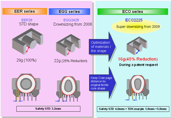 活用高性能材质的优点,以EER28市面上最常用的一种变压器型号分析。由于密度更大,我们可以使变压器更轻、更小。比如在同样功率的情况下,用高性能材质体积和重量会比普通材质更小。这边仅以EER28为例,我们将以ECO2225系列可以取代市场上的EER28,重量有45%的消减。