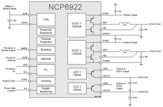 图2:安森美半导体的NCP6922 mini-PMIC集成2路DC-DC、2路LDO及其它多种功能。
