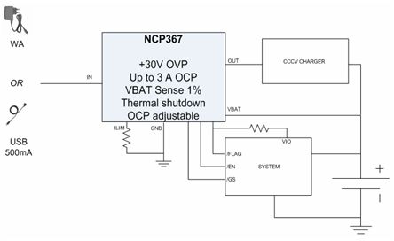 以NCP367为例,这是一款提供+30 V过压保护及高达3 A过流?;ぁ⒋绯氐缪辜觳夤δ艿谋;C(见图5)。这器件?;け阈璞傅绯孛馐苁淙牍?在出现故障工作条件下会断开系统与Vbus或AC-DC适配器的连接)、充电过流及充电过压影响。NCP367提供最大值100 mΩ的低导通阻抗,帮助降低方案成本及电路板占用空间。支持高达3 A电流的能力帮助实现快速充电。典型值50 μA的极低电流消耗兼容于USB 500 μA闲置模式。这器件能用于1.5 A或500 mA两种充电电流等级,非常适合手机等应用。