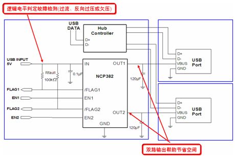 NCP382则是一款功率分配开关,其设计针对很可能会遇到大的电容性负载或短路的应用。实际上,越来越多便携电子设备采用USB供电,但需要?;け镜豒SB电源够用受外部Vbus故障影响。NCP382能够通过在输出负载超过限流阈值或出现短路时切换至恒流模式,将输出电流限制在期望的电平(0.5 A、1 A或1.5 A),从而提供过流保护。NCP381接收2.5 V至5.5 V的单路输入,提供2路输出。图6是NCP382的典型应用电路图。