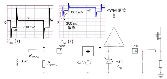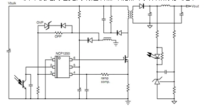如图 1 所示,电路中的光耦合器断路或 TL431 分压器网络遭受严重漂移影响(或其某个电阻丢失或出现错误值)时,输出电压就可能超出规定的限制值,这就是过压条件。大多数情况下,过压条件可能对下行负载有害,适配器这时必须完全关断。NCP1250/1 在 OPP 引脚上也集成了 3 V 参考比较器,这比较器可用于多种功能,如 OVP。如果这 OPP 引脚电压连续四次超过 3 V,就使控制器 IC 闩锁保护。