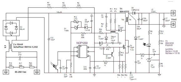 图 4(a):基于 NCP1250 的 19 V/65 W 适配器电路图