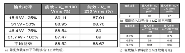 表 1:基于 NCP1250 的 65 W 演电源适配器演示板能效测试结果。