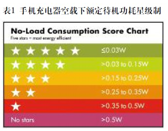 这些关注的结果是采取一系列措施来提升效率和降低空载功耗的需求。其中最新最严格的是由全球前五大手机厂商提出的一项自愿性的充电器星级制协定,用以标志在充电完成之后,充电器仍插在壁式插座上时的耗能量。该星级制从0星级开始,最高5星级??赵叵露疃ù拇笥?.5W的充电器为0星级标签,待机功耗小于0.03W(30mW)的为5星级(见表1)。通过比较,大多数现有手机的待机功耗在150~300mW范围。