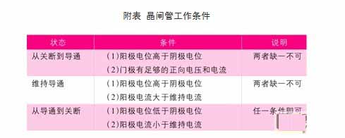 由于晶闸管只有导通和关断两种工作状态,所以它具有开关特性,这种特性需要一定的条件才能转化,此条件如附表所示。
