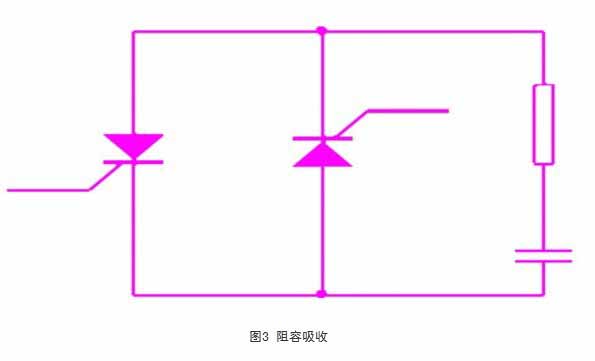 在晶闸管两端并联r-c阻容吸收回路,如图3所示,利用电容吸收过压。其实质就是将造成过电压的能量变成电场能量储存到电容中,然后释放到电阻中消耗掉。