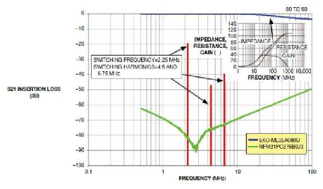 图1,相比一个100 MHz时电阻为68Ω的传统铁氧体磁环,Murata公司的NFM31PC276B0J3 EMI有高的阻抗和低DCR.