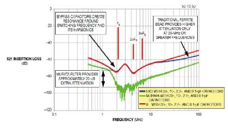 图1比较了一个采用100MHz时电阻为68Ω的Murata EMI滤波器的传统铁氧体磁环插入损耗。电源电路有低的阻抗,在50Ω环境下测出插入损耗。因此,电源滤波器的插入损耗量值可能有少许差异,虽然谐振频率并不变化。