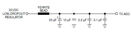 隔离来自ADC开关噪声的一个关键元件是电源滤波器,它包括一个铁氧体磁环和旁路电容。在选择铁氧体磁环时应考虑多个关键特性。首先,铁氧体磁环必须有用于数据转换器的充足额定电流,它必须有低的DCR(直流阻抗),以尽量减少磁环自身的压降。例如,当一个200mA电源通过一个DCR为1Ω的磁环时,产生一个200mV的压降。这个压降可能将ADC上的电压推至边沿,考虑到电源电压的标准差,ADC电压甚至可能低于建议的工作电压?! ?br />