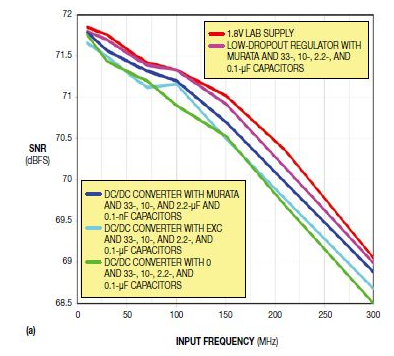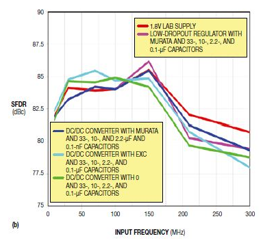 图4,这些SNR(a)和SFDR(b)扫频图比较了一个用低压差稳压器的基准电源(如1.8V的实验室用干净电源),以及一个采用ADS4149评估模块、有不同电源滤波器选项的DC/DC转换器。