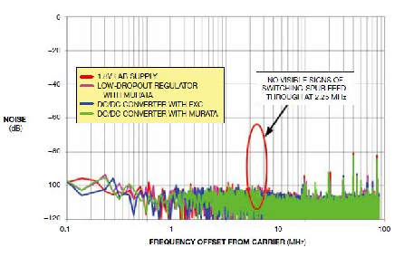 测试结果表明,在300MHz的中间频率下,当用开关稳压器供电时,SNR性能比低噪声低压差稳压器下降了大约0.3dB.而各种方式的SFDR性能几乎相同。通过仔细观察正态化的FFT图(开始于输入信号,绘制的是噪声与偏移频率关系图),表明当使用次优的EXC铁氧体磁环时,整个Nyquist区中的背景噪声略有升高,而没有任何开关频率馈入的迹象(图5)。