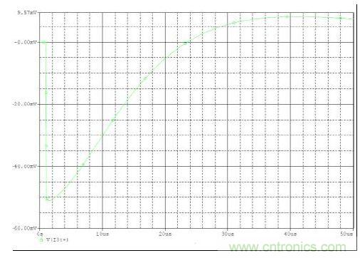 下面是一个如何使用上述关系的示例。问题是根据200kHz开关电源10 amp变化幅度允许范围内的50mV输出变化挑选一个输出电容。所允许的峰值输 出阻抗为:Zout=50 mV / 10 amps 或5毫欧。这就是最大允许输出电容ESR。接下来就是建立所需的电容。幸运的是,ESR和电容均为正交型,可单独处理。一 个高 (Aggressive) 电源控制环路带宽可以是开关频率的1/6或30kHz。于是在 30 kHz 时输出滤波电容就需要一个不到5毫欧的电抗,或高于1000uF的电容。 图2显示了在5毫欧ESR、1000uF电容以及30 kHz电压模式控制条件时这一问题的负载瞬态仿真。就校验这一方法是否有效的10amp负载变动幅度而言, 输出电压变化大约为52mV。