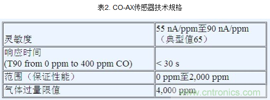 图1所示为 Alphasense公司的CO-AX传感器。表2是CO-AX传感器技术规格摘要。