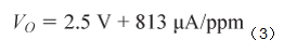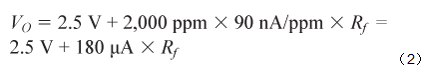 传感器的最大响应为90 nA/ppm,如表2所示,其最大输入范围为2,000 ppm。因此,最大输出电流为180 μA,最大输出电压由跨导电阻决定,如公式2所示。