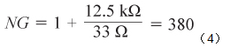 电阻R4使跨导放大器的噪声增益保持在合理水平。R4的值需权衡两个因素:噪声增益的幅度和暴露于高浓度气体时传感器的建立时间误差。对于本电路,R4 = 33 Ω,由此可计算噪声增益等于380,如公式4所示。