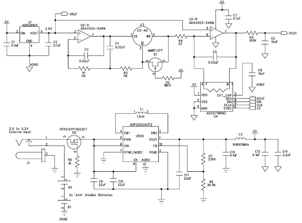 该电路由两节AAA电池供电。使用二极管提供反向电压?;せ崂朔驯蟮牡缒?,因此本电路使用P沟道MOSFET (Q2)。该MOSFET通过阻塞反向电压来?;さ缏?,施加正电压时导通。MOSFET的导通电阻小于100 mΩ,因此它引起的压降远小于二极管。除AAA电池以外,降压-升压调节器ADP2503还允许使用最高5.5 V的外部电源。在省电模式下工作时,ADP2503的功耗仅38 μA。由L2、C12和C13构成的滤波器可消除模拟电源轨产生的任何开关噪声。连接外部电源时,该仪表不是通过一个电路来断开电池,而是利用一个插孔以机械方式断开电池,从而避免电能浪费。