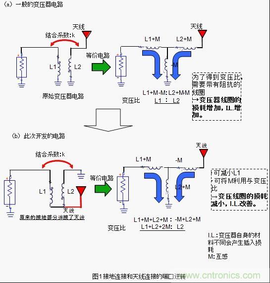 为了削减这种阻抗成分并维持变压比,我们采用了图1所示的高频变压器的构造。该构造跟普通的变压器构造相反,它将接地连接端口跟天线连接端口完全逆反。因此,才能达到如图1所示的变压比。使用该构造的话,因结合产生的互感M值会反应到变压器,变压器中使用的线圈L值会减小,由于高频变压器的阻抗成分I.L.可以被抑制得很小。