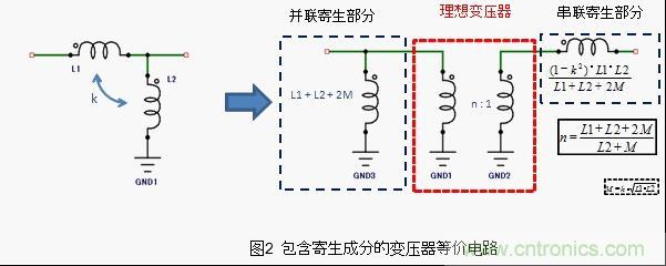 如果在这样的天线中安装一定变压比的变压器,是不能只整合一个band的阻抗的。所以,天线用变压器,必备的设计需求是要使变压比适应天线的阻抗频率特性。这种适应方法如图2所示,是一种将理想的变压部分和寄生成分部分分解开来的等效电路。