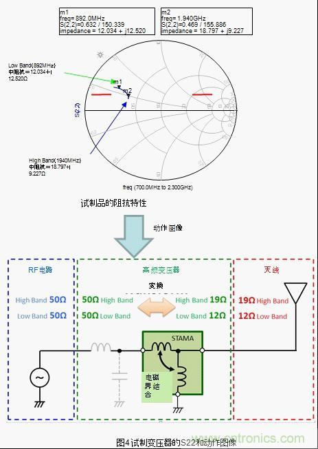 将普通的LC电路跟天线连接,根据频率特性的不同在广带宽情况下阻抗整合会变得困难。针对该情况,将本次试制的高频变压器跟天线连接,low band和high band都转换成了最合适的阻抗。也就是说,工匠图上的阻抗轨迹有可能变化成阻抗整合容易的形状。之后通过外部的调节元件将阻抗轨迹的相位进行微调,有可能非常容易的就集中在50Ω附近了。(图5)