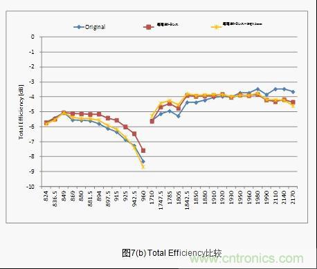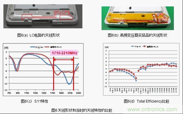 结果显示,low band 情况下LC电路和高频变压器都不可能达到「S11<-6dB」(反射损耗1.2dB)。而high band情况下,达到「S11<-6dB」范围的,如果使用LC电路的话是300MHz,而使用高频变压器的话则是500MHz,达到了66%的改善效果。(图6(c)) 。此外,LC电路和高频变压器中天线的综合特性显示「Total Efficiency」,low band的高频侧也得到了0.6dB的改善效果。(图6(d))。这种改善效果正是由于带宽的广带宽化和I.L.得到了改善。