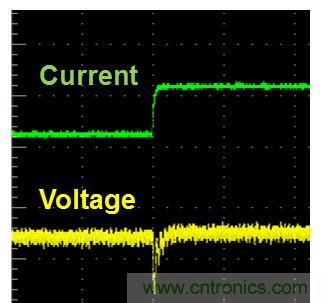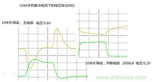 在加入电容后,对提升电路的瞬态响应能力,往往会起到比较明显的效果。如图4所示的,我们在用一个通用电源测量GSM手机脉冲电流,在没有并联电容的时候,瞬间电源跌落会达到0.6V (见图4左). 对于一个工作在3.8V的手机来说,这样大的电源跌落足以造成手机自动关机。当我们并联了一个2000uF的电容后,电源跌落降到了0.2V以下,得到明显改善,见图4右所示(图中,黄色曲线为电压,绿色曲线为电流)。