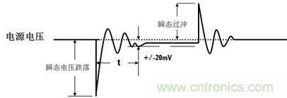 大部分直流电源的瞬态电压过冲或跌落幅度不被表征或定义, 这是由于该参数很大程度上取决与负载的特性。 通常情况下,这个值会小于1V。 但市面上有些电源的瞬态响应时间过长,如果处理不好,在负载、电源及导线共同影响下, 过冲电压可能会达到1-4V。