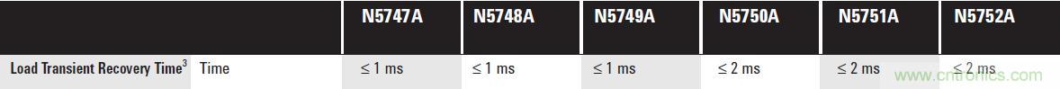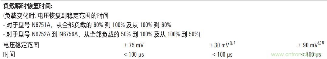 直流电源的瞬态响应时间快慢和跌落的幅度不尽相同。例如,安捷伦N6705B直流电源分析仪中所用的高性能模块N675xA, 瞬态响应指标如下: