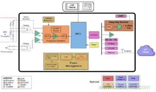 虽然基本传感器变送器电路的 MCU 和数据转换器通常专为低工作电流而优化,但是高性能智能传感器应用中增加的功能导致了电流需求的升高。例如:当该电路包含了诸如隔离、校准和诊断、液晶显示器接口、或无线连接选项(如蓝牙低能耗或无线 HARTâ)等特性时,电流消耗将较大。