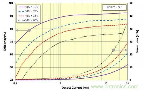 LM5165 中内置的面向智能传感器应用的各种特性包括一种用于实现最佳解决方案尺寸的简单控制架构、用于提供低压差的 100% 占空比能力、一个用于电源轨排序和故障报告的漏极开路电源良好指示电路、在内部固定或从外部可调的软起动 (SS)、以及具有可定制迟滞以提供可编程线路欠压闭锁 (UVLO) 功能的高精度启用。而且,一种可调的逐周期电流限制优化了电感器选择和尺寸。图 3 显示出了对于 0.1mA 至 30mA 负载电流的转换器效率和功率耗散。