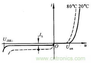 在环境温度升高时,二极管的正向特性曲线将左移,反向特性曲线将下移,如图1所示。在室温附近,温度每升高1℃,正向压降减小2~2.5mV;温度每升高10℃,反向电流约增大一倍。可见,二极管的特性对温度很敏感。