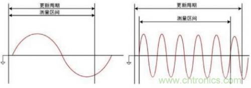 3.选择合适的量程、更新率和同步源对功率分析仪的测量准确性至关重要。例如当更新周期小于被测信号周期时,如下图4所示,整个更新周期内的数据成为测量区间,整个更新周期内的采样数据将被平均,因此影响测量结果的准确性。在这种情况下需要增大更新周期,使得包含更多周期的被测信号进入测量区间;