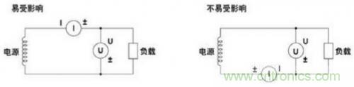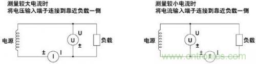 5.降低功率损耗的影响,在测量大电流情况下,需要将电压测量回路接到靠近负载一侧,电流测量回路测得的结果就是流经负载和电压测量回路的电流之和,测量误差仅是流经电压测量回路的电流。在测量小电流情况下,则需要将电流测量回路接到靠近负载一侧,电压测量回路测得的结果就是负载电压和电流测量回路的电压之各,测量误差仅是电流测量回路两端电压;如图6所示。