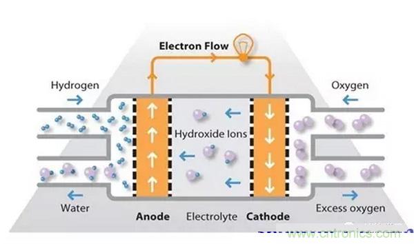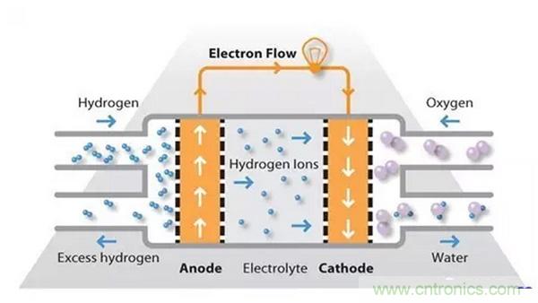 氢燃料在阳极处被处理,其中电子与铂基催化剂的表面上的质子分离。质子通过膜到达电池的阴极侧,同时电子在外部电路中行进,产生电池的电输出。在阴极侧,另一个贵金属电极将质子和电子与氧气结合以产生水,其作为唯一的废物排出;氧可以以纯化形式提供,或者在电极处直接从空气中提取。