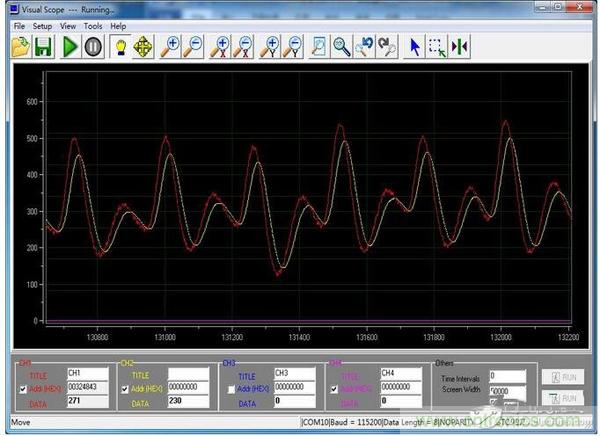 LDO本身的电压输出非常稳定,由于笔者ADC采样为10位,在手指未放入传感器时,电压值几乎保持在3/1024以内跳动。所以笔者默认这款LDO能达0.3%以下的精度。下图便是笔者关于LDO给模拟部分供电后的心率采样波形。红色为一阶低通滤波前的波形,黄色为低通滤波后的波形。对实时性要求不高的系统来说,这样的模拟量波形已经能够满足项目的需求。