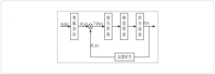 电流传感器的系统框图所示。电流所产生的的磁场在磁通门探头内经激励信号调制后,通过峰值检波和积分滤波电路产生有用的电压信号,然后经过反馈,使电流传感器工作在零磁通状态。