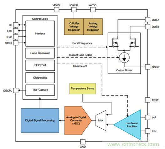 超声波传感技术也是一项具有成本竞争力的技术,特别是在使用PGA460等集成解决方案时,其中已包括大部分所需的芯片。PGA460既可以使用半桥或H桥直接驱动传感器,也可以使用变压器驱动传感器;后者主要用于密封的的“密闭”传感器。PGA460还包括用于接收和调节超声回波的完整模拟前端。此外,该器件还可以通过数字信号处理来计算ToF(见图4)。