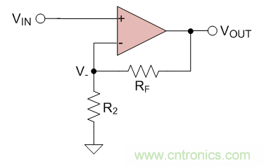 等式中A_CL是闭环增益,R_F 是反馈电阻值,而R_2 是从负输入端到信号(反相)或接地(非反相)的电阻值。