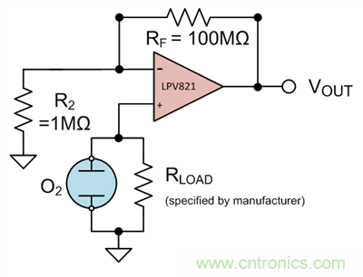 用氧气传感(见图 3) 作为具体的应用实例,假设感应器的最大输出电压为10mV(通过制造商指定的负载电阻将电流转换成电压R_L) ,则运算放大器的满量程输出电压为1V。通过Equation 2,可以看出 A_CL  的值需要为100,或者R_F是R_2的100倍。分别选择100MΩ电阻和1MΩ电阻,得出增益值为101,且电阻值足够大到可以限制电流并最小化功耗。