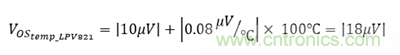 为最小化偏移误差,LPV821零漂移毫微功耗运算放大器是一款理想器件。 使用Equation 5并假设操作温度范围为0°C—100°C,该器件产生的最大偏移误差为: