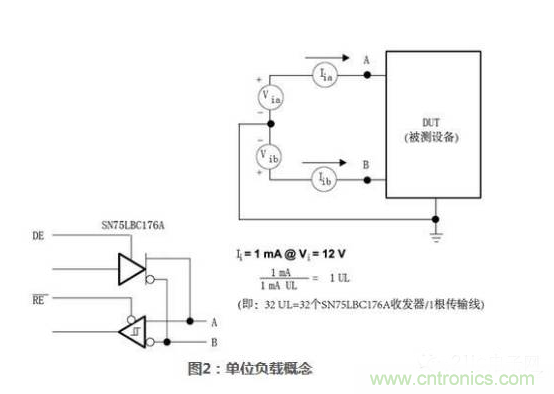 图2给出了SN75LBC176A收发器单位负载计算的例子。因为这款设备将驱动器和接收器集成到一起构成了收发器(即驱动器输出和接收器输入连接到了同一根总线上),因此很难分别获取驱动器泄漏电流和接收器输入电流。为了便于计算,将接收器输入阻抗看作12 k?并给收发器1mA电流。这可以代表一个单位负载,一跟传输总线上允许32个这样的负载。