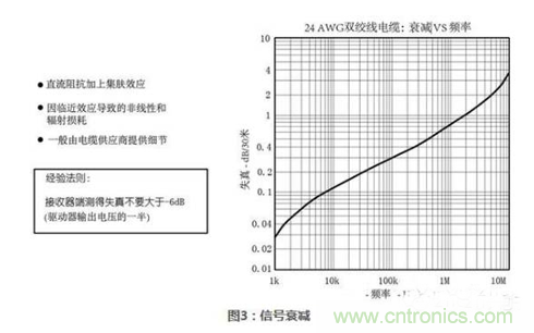 2.2信号衰减和失真一个有用的常识是:在最大信号速率(单位:Hz)通讯的条件下,允许信号衰减-6dB。一般情况下,电缆供应商会提供信号衰减图表。图3所示的曲线显示了24-AWG电缆衰减和频率的关系。
