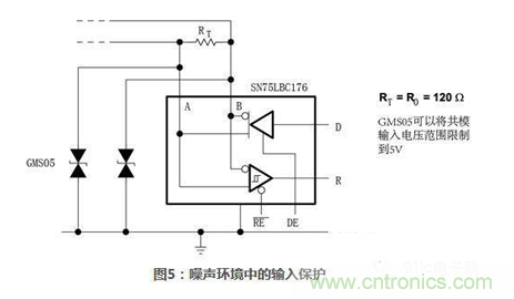 电流隔离能够提供更好的系统级?;ぃ羌鄹褚哺?。更流行并且比较便宜的方案是使用二极管?;?。使用二极管方法代替电流隔离是一种折衷方法,在更低层次上提供?;?。外接二极管和内部集成瞬态?;ざ艿睦尤缦峦妓荆和?所示485收发器SN75LBC176外接二极管来防止瞬态毛刺。