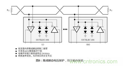 图6所示内部集成瞬态抑制二极管的485收发器SN75LBC184,用于既希望使用完整485功能,PCB空间又受限的场合。SN75LBC184在内部集成了?;ざ埽攵愿吣芰康缙肷肪?,可直接替换SN75LBC176。