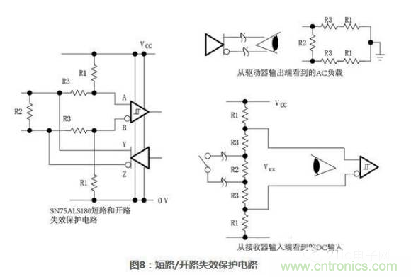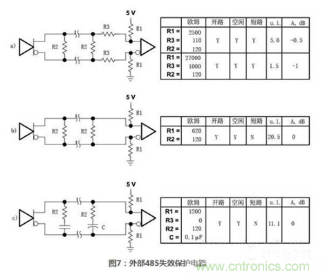 使用这样的内部上下拉电阻允许总线不进行终端匹配,但是会显著的降低最大信号速率和可靠性。图7给出了一些485接口通用外置失效?;さ缏?,每个电路都尽力维持接收器输入端电压不小于最小临界值并在一个或多个故障条件(开路、空闲、短路)下,维持一个已知的逻辑状态。