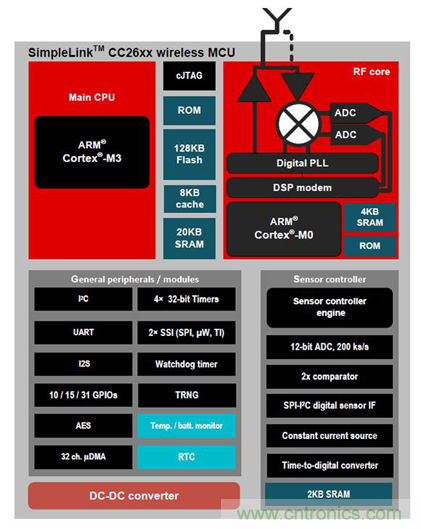 MCU带集成蓝牙®低功耗无线电:采用TI的SimpleLink超低功耗无线MCU平台,具有低功耗无线电和MCU组合使传感器终端节点的电池使用寿命延长。而且,CC2650设备是一个多标准设备,针对蓝牙、ZigBee®、6LoWPAN和ZigBeeRF4CE??仄饔τ?。在这个TI设计中,蓝牙是可选择的协议,但是硬件也可以与其他协议一起工作。